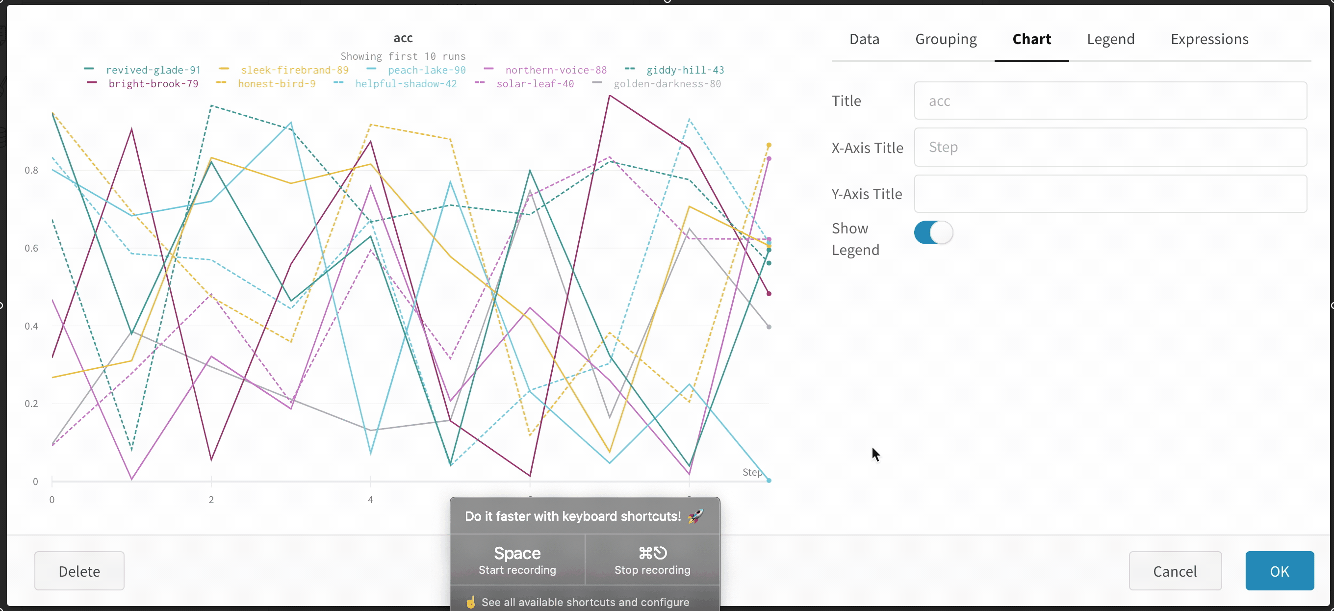 - Y Axis Expressions: Add calculated metrics to your graph. You can use any of the logged metrics as well as configuration values like hyperparameters to calculate custom lines.