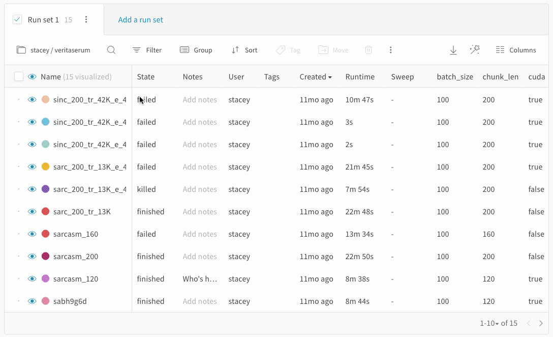If you need to compare runs from two projects and the columns are not working, add a tag to the runs in one project and then move those runs to the other project. You will still be able to filter only the runs from each project, but you will have all the columns for both sets of runs available in the report.